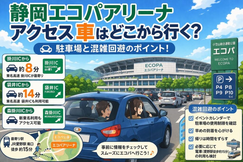 ねえ、エコパのライブやイベントに車で行こうと思ってるなら、ちょっとだけ聞いてほしいんだけど。 静岡エコパアリーナって、車でアクセスできる大きな会場なんだけど、「どのICから行けばいいの?」「駐車場ってちゃんと停められる?」「当日渋滞に巻き込... イベント・旅行
