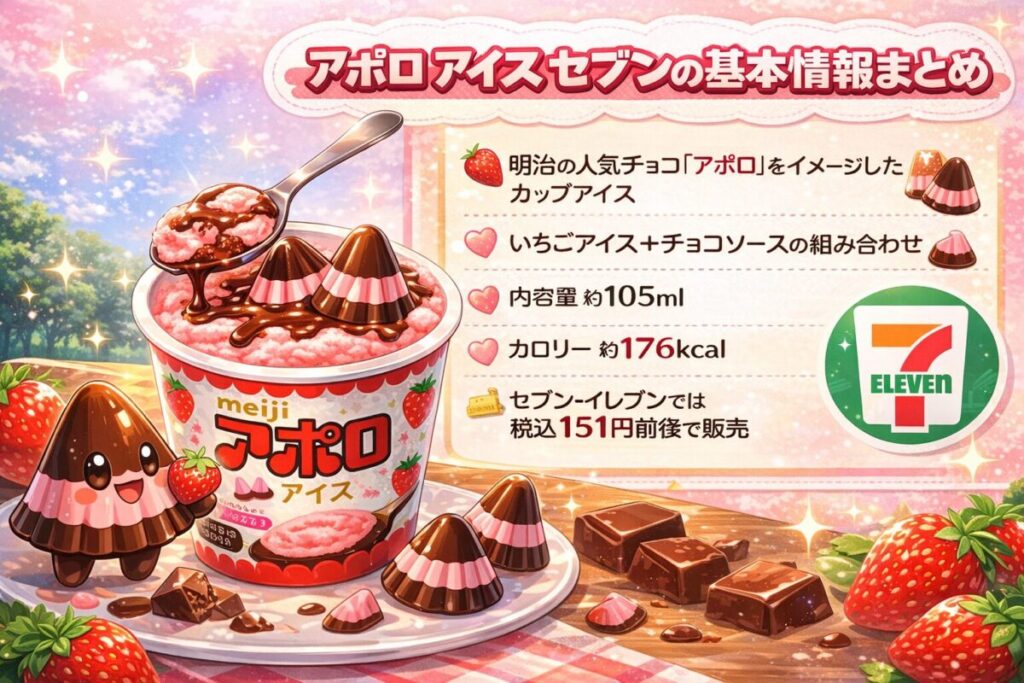 アポロ アイス セブンの正体は、明治のあのロングセラーチョコ「アポロ」をイメージして作られたカップアイスで、いちご果汁入りのいちごアイスととろっとしたチョコソースが合わさった2層構造が魅力なんだよ。