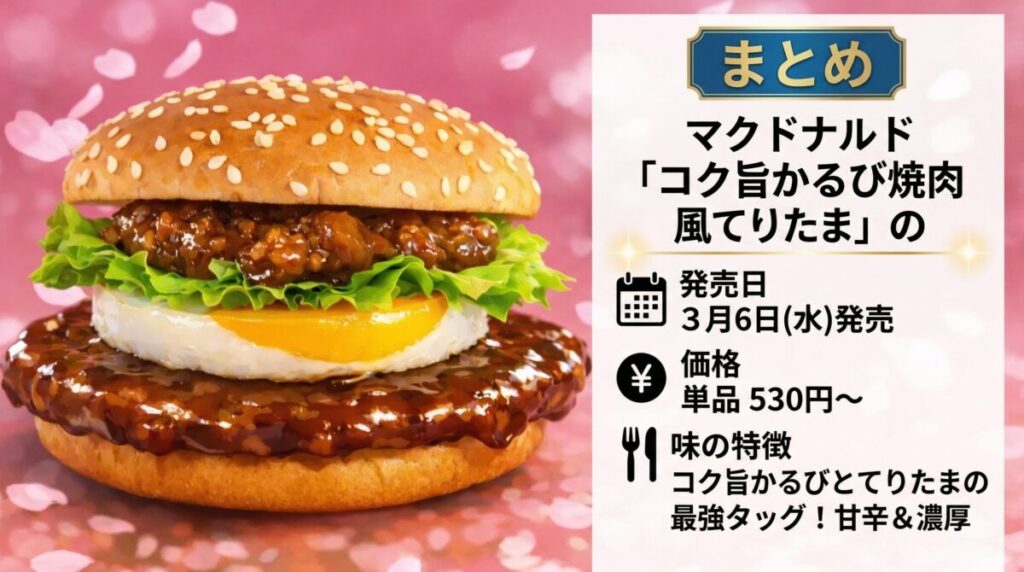 まとめ|マクドナルド「コク旨かるび焼肉風てりたま」の発売日・価格・味の特徴