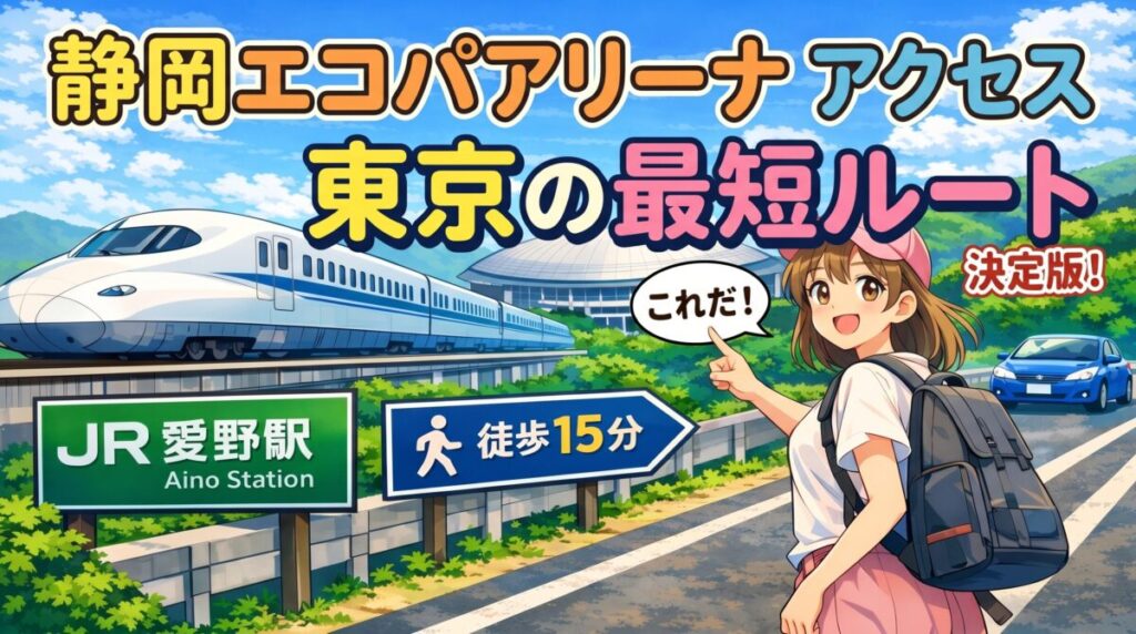 東京から静岡エコパアリーナへ向かうなら、東京駅から新幹線で掛川駅へ、そこから在来線で愛野駅まで1駅移動して、南口から徒歩約15分で会場に着くのが基本の流れだよ。