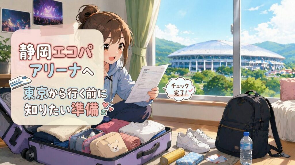 東京から静岡エコパアリーナへ遠征するときは、通常のライブ持ち物に加えて徒歩移動を意識した準備があるとかなり安心だよ。