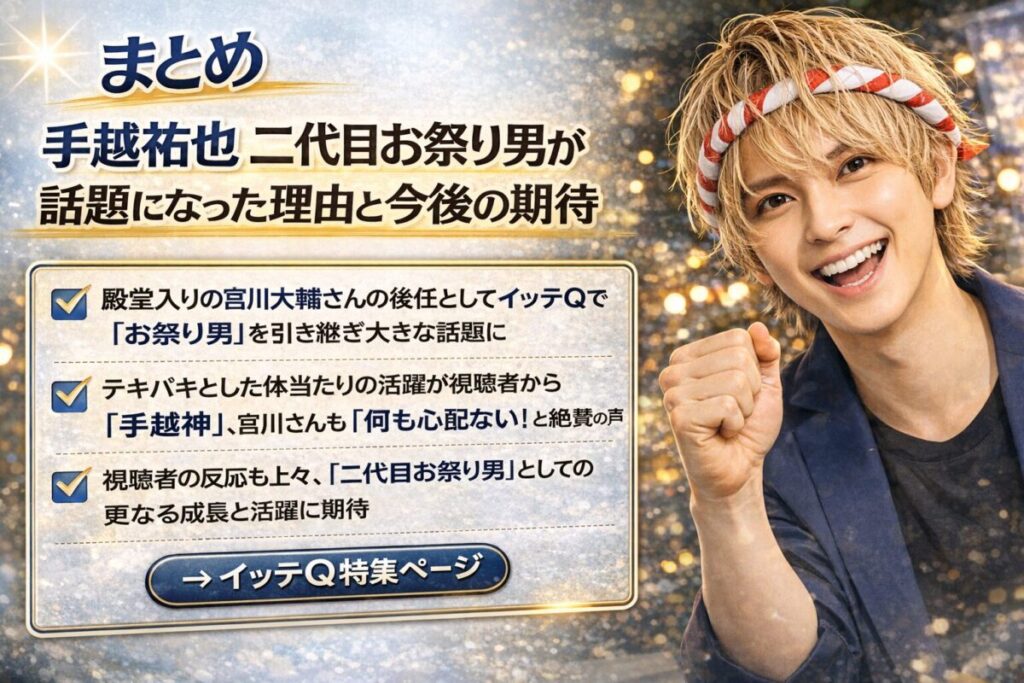この記事では、手越祐也さんが『イッテQ!』で”二代目お祭り男”として注目された理由を、ひとつずつほぐして紹介していくよ。